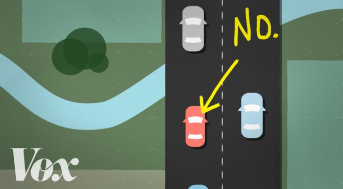 Se você fica dirigindo na faixa da esquerda enquanto outros carros te ultrapassam pela direita, você está contribuindo para o aumento do risco no trânsito. Não faça isto.